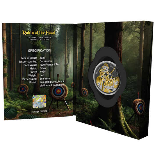 Robin of the Hood Sherwood 1 Oz Silbermünze 2$ Niue 2024 - Multimetal Plating, Hologram, Numbering