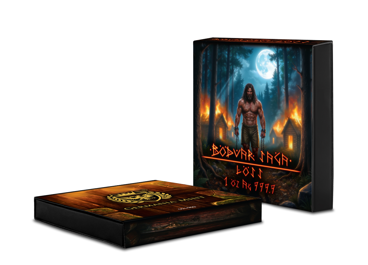 Die Bödvar‑Saga ist tief verwurzelt in der altnordischen Mythologie. Die Münze zeigt Bödvar in dynamischer Pose und vereint traditionelle Motive mit modernen Prägungstechniken. Die farbliche Akzentuierung und der Antique‑Look verleihen dem Motiv außergewöhnliche Tiefe und Charakter.