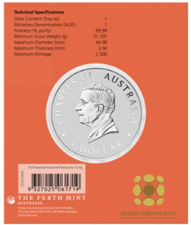 Die Silbermünze Koala wurde aus einer Unze 99,99% reinem Silber geprägt. Die Perth Mint gibt die Australian Koala Münze seit 2007 mit jährlich wechselndem Motiv aus. Das Motiv der 2025er Ausgabe zeigt einen Koala, der den Ast eines Eukalyptusbaumes hinaufklettert. Ebenfalls im Design enthalten sind die Aufschriften "KOALA" und "2025 1 oz 9999 SILVER". Als Sonderausgabe zur Beijing International Coin Expo, die vom 31. Oktober bis 2. November 2025 stattfindet, zeigt das Motiv dieser Münze zusätzlich ein Privy Mark "Panda". Auf der Rückseite sind das Bildnis von König Charles III. sowie der Nennwert zu sehen.
