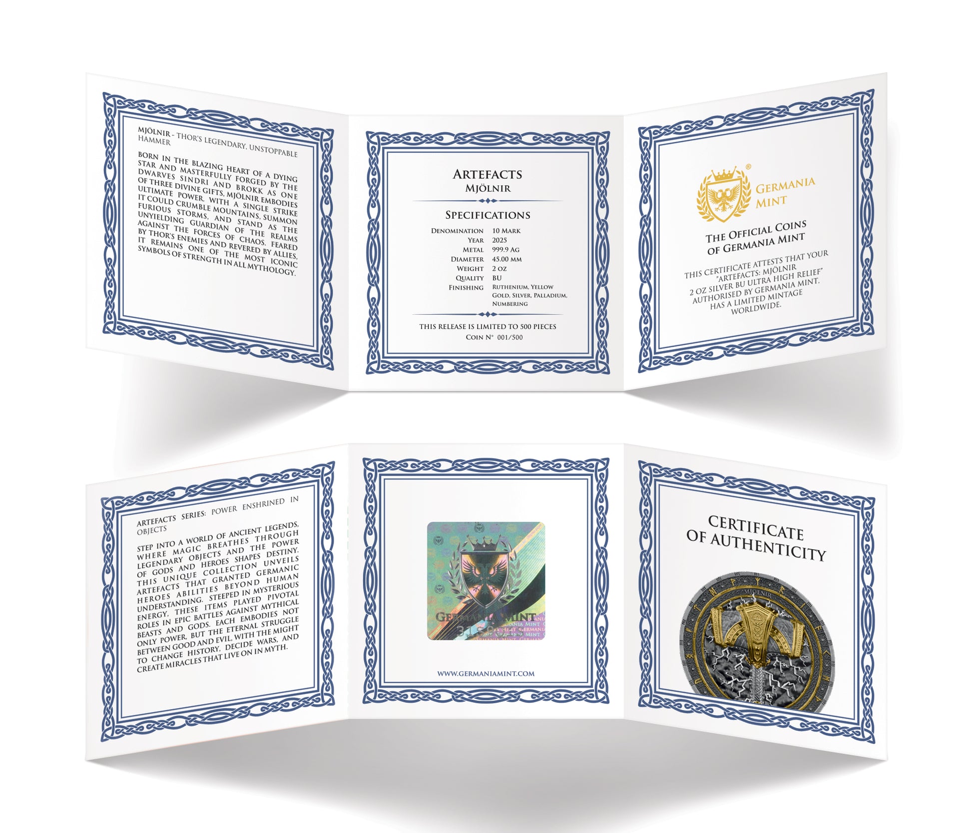 Der mythische Hammer Thors, des Gottes der Stürme und des Donners, wurde von den Zwergen Sindri und Brokk als eines der drei Geschenke an die Götter geschmiedet. Thor konnte mit ihm mit unendlicher Kraft zuschlagen, und einmal geworfen, kehrte er immer wieder in seine Hand zurück. Der Hammer wurde auch zum Symbol für Asgards Schutz vor den Riesen. Die 2 Oz Feinsilberausgabe in Stempelglanz BU mit Ultra High Relief und Ruthenium, Palladium und Goldveredelung ist weltweit auf nur 500 Stück streng limitiert.